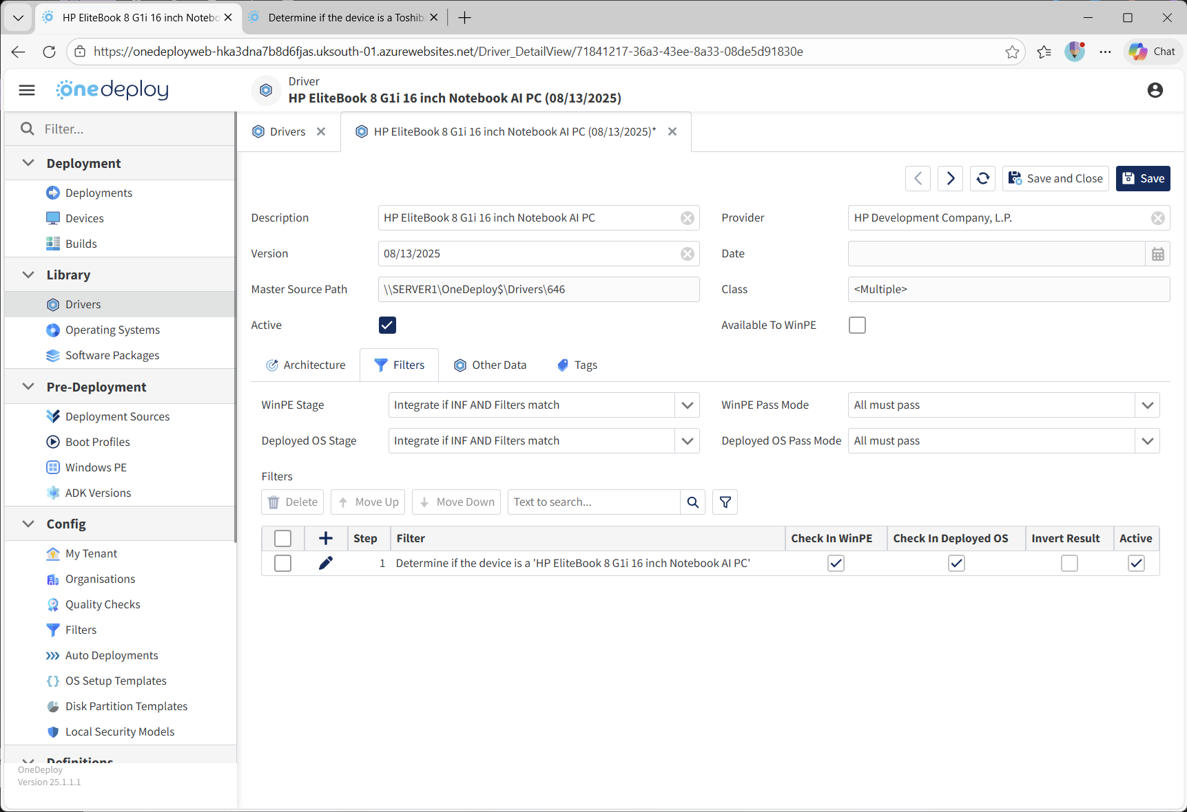 - The Filter criteria must also match, in this case, if the device’s model string as read from the BIOS is not ‘HP EliteBook 8 G1i 16 inch Notebook AI PC’ then the Filter is not true and the Driver will not be used. For any other model of PC, this Driver will not be offered.