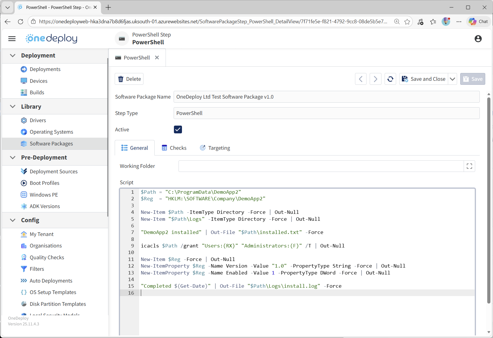 When you add a PowerShell step to a Software Package, the PowerShell properties screen is displayed.